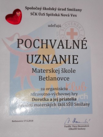 Štyri mesiace plánovania, zháňania, premýšľania, vybavovania, organizovania, rozhovorov a telefonátov. Vo štvrtok 17.5.2018 sa u nás konala veľká sláva, obvodová prehliadka detí zapojených do projektu Dorotka a jej priatelia. Spoluorganizátormi akcie boli Slovenský Červený kríž, Spoločný školský úrad Smižany a Obec Betlanovce. Cieľom podujatia bolo upevniť poznatky a praktické zručnosti detí v oblasti zdravého spôsobu života, ochrany zdravia, poskytovania prvej pomoci a predchádzania úrazom a ochoreniam.
