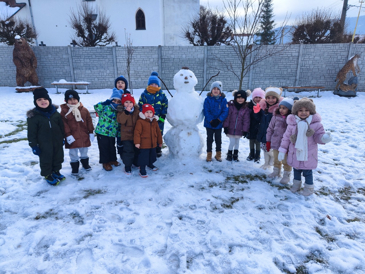 V priebehu zimného dopoludnia si deti užili zábavu na školskom dvore. Spoločne postavili veľkého snehuliaka, ktorý teraz zdobí naše vonkajšie priestory.